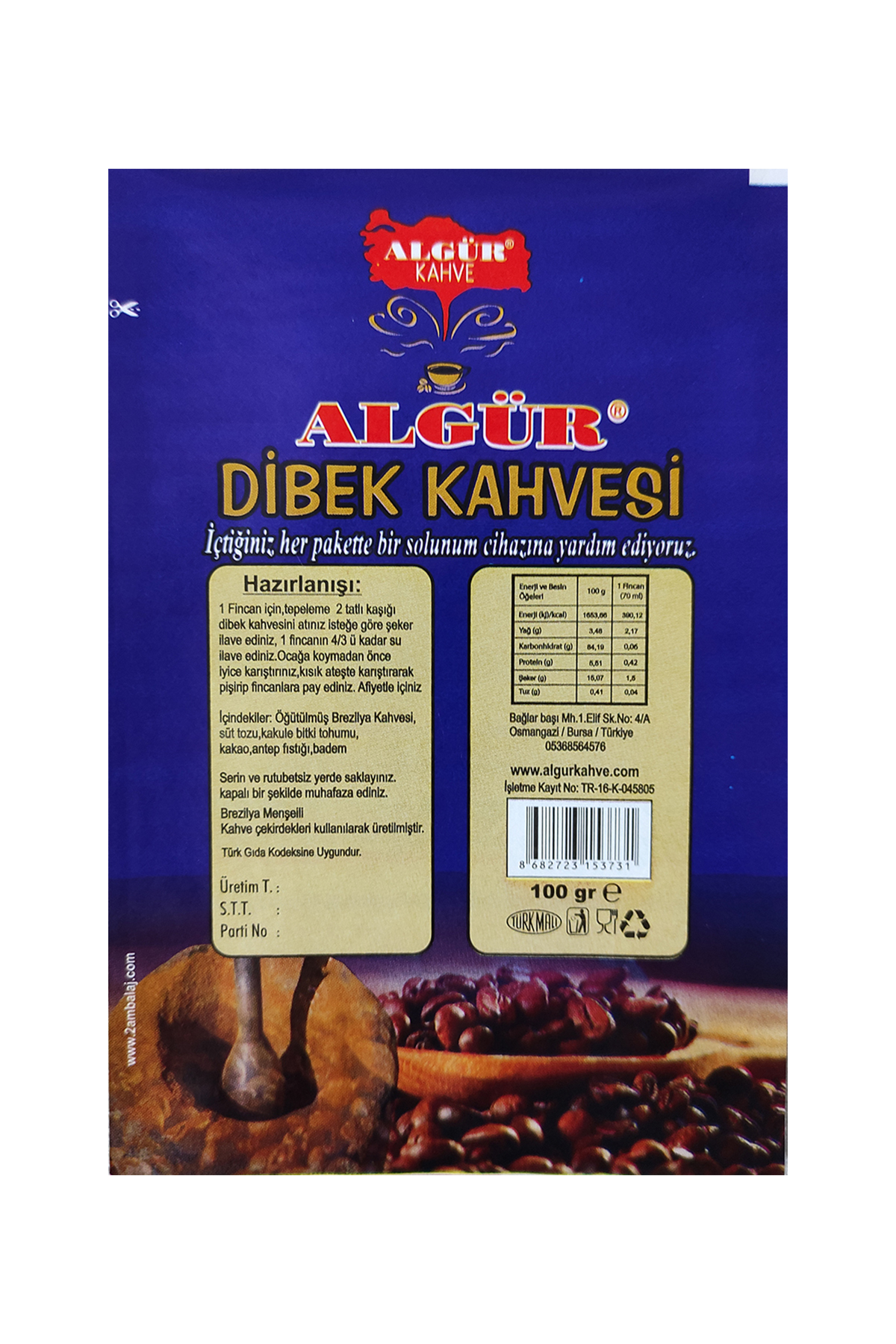 Algür Kahve Dibek Kahvesi 100 Gr. İçindekiler; Öğütülmüş Brezilya Kahvesi, süt tozu, kakule bitki tohumu, kakao, antep fıstığı, badem. Tipi; orta kavrulmuş, Derecesi; İnce Öğütülmüş Türk Kahvesidir. Brezilya menşeili kahve çekirdekleri kullanılarak hizmetinize sunulmaktadır. Türk Gıda Kodeksine Uygundur. İÇTİĞİNİZ HER PAKETTE BİR SOLUNUM CİHAZINA YARDIM EDİYORUZ. KAHVE RENGİ DE DUYGUSALDIR.